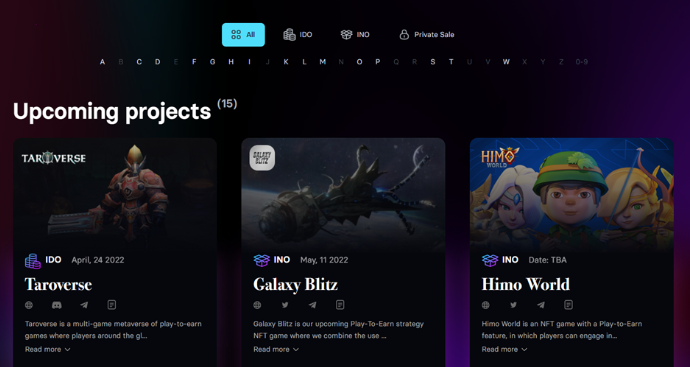This feature provides a more unified view to sort items launched on the NFTb Launchpad. Users can now easily filter and view all upcoming projects, or select only IDO, INO or private sales.