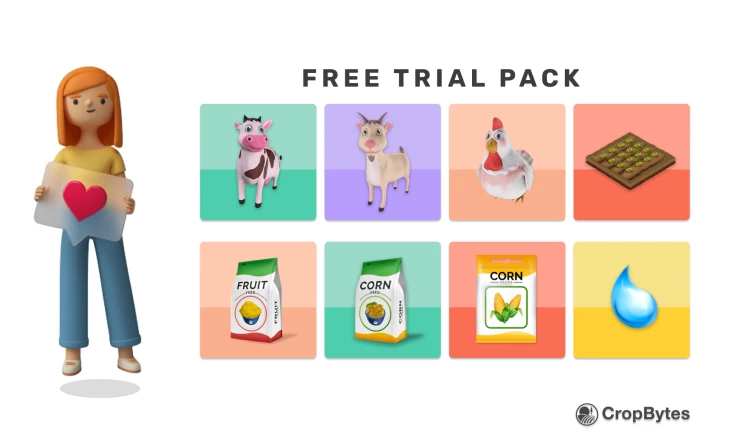 You will receive a welcome gift upon signing up. FREE TRIAL ASSETS available for only 7 days that consists of 1 Cow, 1 Goat, 1 Hen, 1 Small Cropland, 3 Fruit Feed, 24 Corn Feed - enough to feed your 3 animals for 3 days, 5 Water for your crop and 5 Corn Seeds