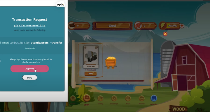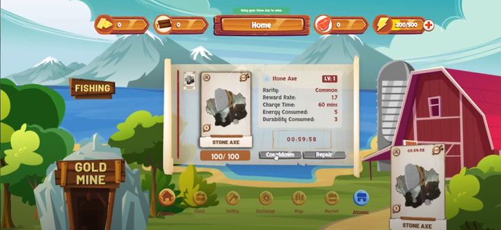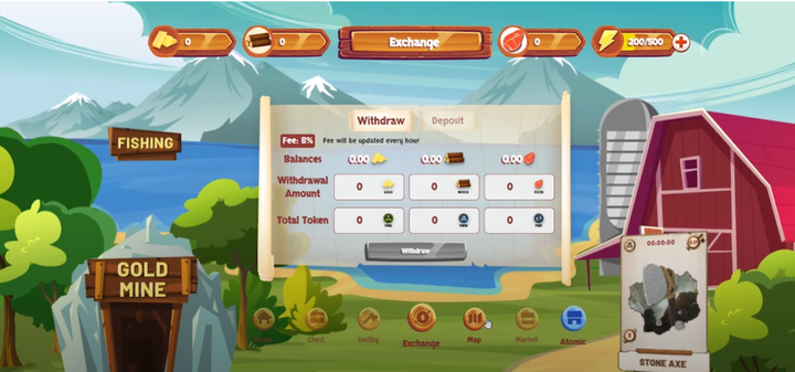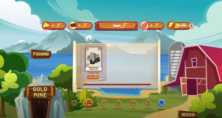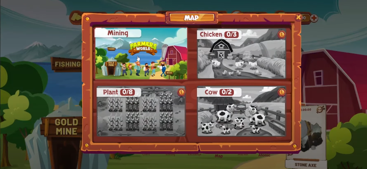 2. Para iniciar o jogo, os jogadores precisam adquirir as ferramentas (NFTs) que precisam ser usadas no jogo. As ferramentas são divididas em três categorias, cada uma produzindo materiais diferentes (os materiais podem ser trocados por dinheiro). Os jogadores podem usar máquinas de mineração para cavar moedas de ouro, machados e serras podem obter moedas de madeira, varas de pescar e barcos de pesca podem obter moedas de comida, então os jogadores devem escolher suas próprias ferramentas de acordo com sua própria força. Os jogadores precisam equipar pelo menos uma ferramenta (como: machado de pedra, serra, vara de pescar, etc.) antes de iniciar o jogo. Atualmente, a ferramenta com o preço mais baixo é o machado de pedra (vá ao mercado Farmersworld Collection para ver os atributos e preços de várias NFTs de ferramentas), e comprar um machado de pedra também é seu limite mínimo de entrada.