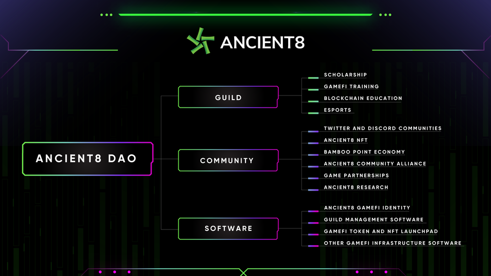 Ancient8, yazılım ve topluluğa odaklanarak GameFi için altyapı geliştiriyor. Ancient8, GameFi ve Metaverse projeleri için milyonlarca kullanıcıya pazarlama dağıtım kanalı olarak hizmet etmek üzere GameFi Identity ve Launchpad ürünlerini inşa ediyor. Ancient8, Vietnam'ın en büyük blockchain oyun loncasını yönetir ve herkesin blockchain yazılım ürünleri, lonca bursu, blockchain eğitimi, kurumsal düzeyde araştırma ve topluluk aracılığıyla Metaverse'yi oluşturmasını sağlar. Ancient8'in vizyonu, Metaverse'deki sosyal ve finansal erişimi demokratikleştirmektir.