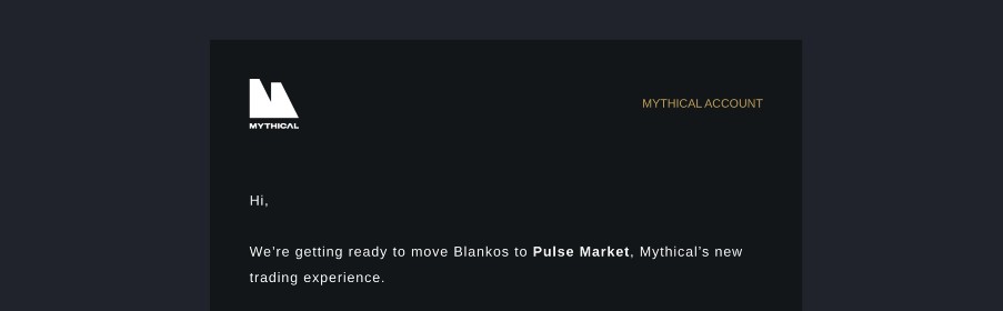 However, while Blankos owners will be able to log into Pulse Market using the same email as they currently use for Mythical Market, they will have a separate wallet, which will not be able to access their MYTH balance for the Mythical Market. This suggests Pulse Market could use different infrastructure.