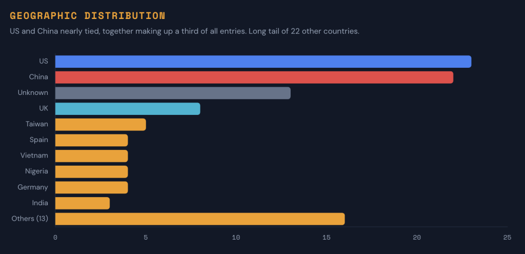 The top reported countries were the US and China, with the UK, Taiwan, Spain, Vietnam, Nigeria and Germany also well represented.