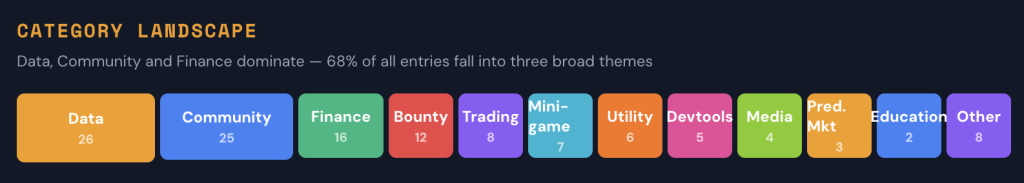 In terms of the type of projects submitted, it wasn’t a surprise to see data and community as the key categories. After all EVE Frontier is a blockchain-based MMOG, generating massive amounts of data, and requiring strong collaboration between players.