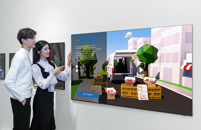 三星电子模型介绍了通过 Neo QLED 8K 和位于首尔蚕室乐天世界大厦购物中心的 The Frame 展示的 NFT 作品。 /照片=由三星电子提供